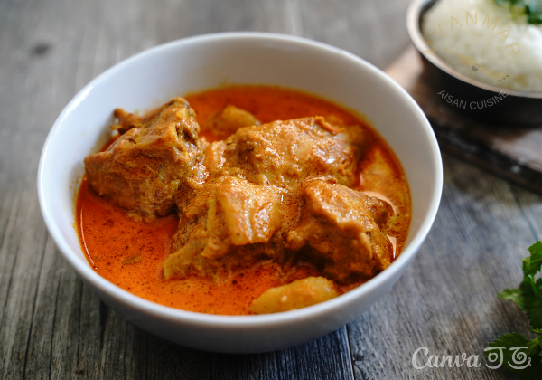 mit Hühnerkeule ohne Knochen, Reis, Kartoffeln, Zitronengras, Ingwer, Zitronenblätter, Zwiebel und serviert mit einer Portion Reis
